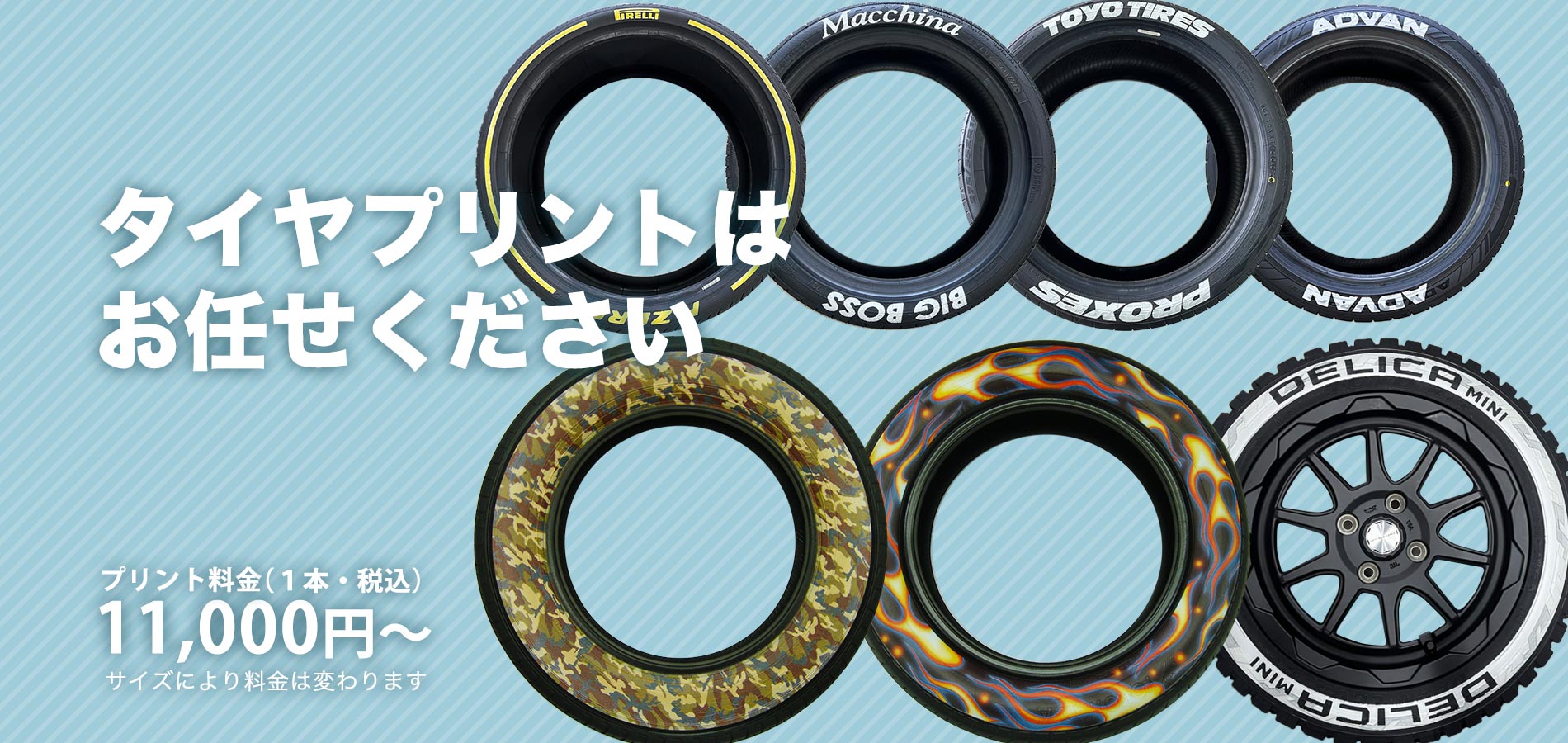 自動車は勿論、トラック、バイク、自転車まで幅広くタイヤのプリントを行うことができます。お客様の大切なタイヤを丁寧にプリントいたしますのでご希望のデザインをお考えの上、お気軽にご連絡ください。
